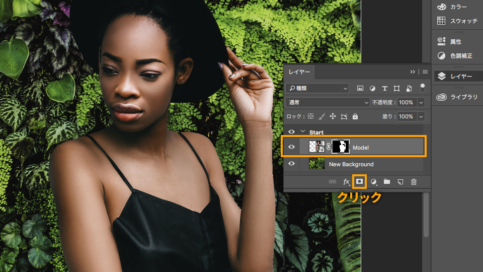 元の編集画面に戻ったら、レイヤーパネル下部の「レイヤーマスク」ボタンをクリックします。マスクが作成され、人物以外の背景が消えて、下のレイヤーが表示されます。これで、人物と新しい背景が合成されました。