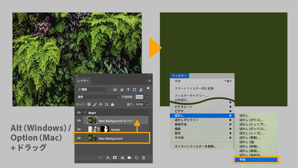複製された「New Backgroundのコピー」を選択した状態で、「フィルター」→「ぼかし」→「平均」を選択すると、画像全体が緑色に変わります。