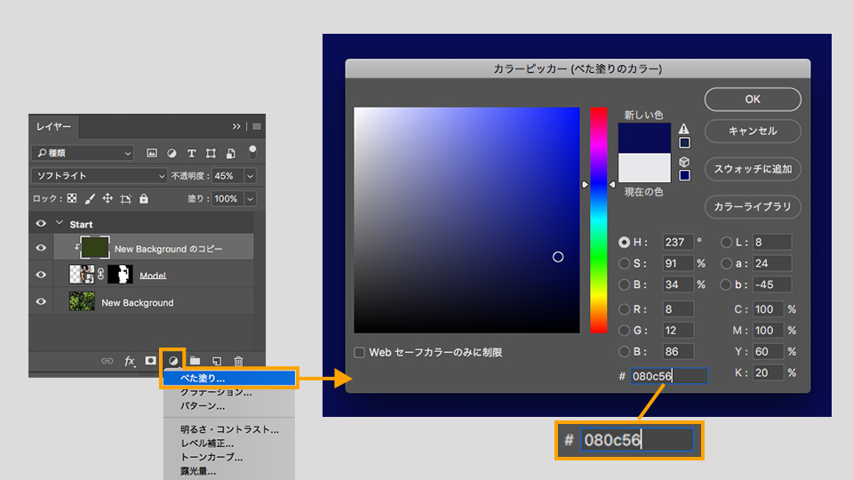 最後にもう一つ、カラー効果を適用して全体を仕上げます。レイヤーパネル下部の「塗りつぶしまたは調整レイヤーを作成」ボタンをクリックし、ドロップダウンメニューから「べた塗り」を選択します。カラーピッカーが表示されるので、紺色(♯080c56)を指定します。