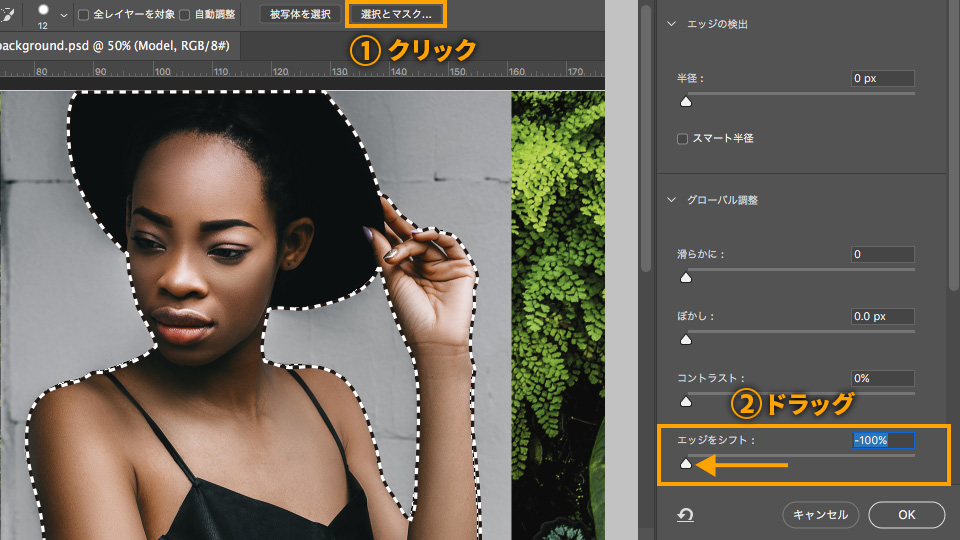 オプションバーの「選択とマスク」をクリックすると、専用のインターフェイスに切り替わります。画面右の属性パネルの「エッジをシフト」で、スライダーを「−100%」までドラッグし、選択範囲の境界線を内側にします。調整ができたら、「OK」をクリックします。